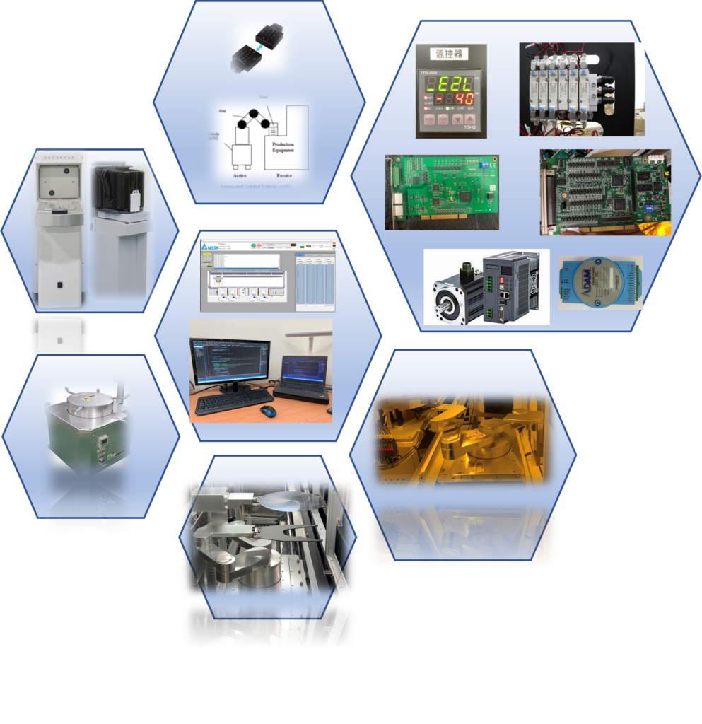 • 我們熟悉半導體產業標準控制單元,Robot、OCR、LoadPort、AGV-E84 .. 等,配合開發相關自動化設備, EFEM 晶圓傳送、SORTER 、Load&Unload,以及濕製程相關領域備份