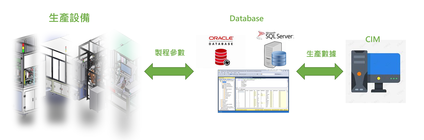 •   • 利用資料庫(Oracle-SQL、SQL Server)DB,與客戶 CIM 資料連結。